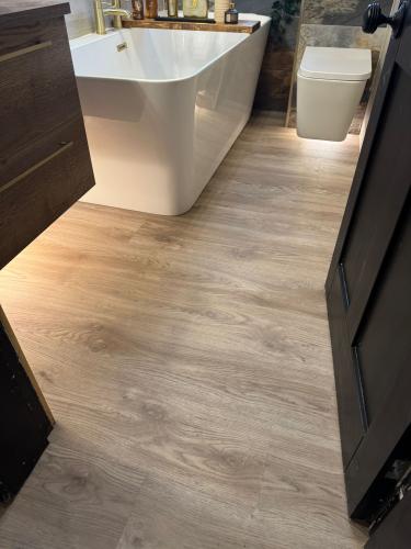 This beautiful bathroom is finished off by Moduleo Roots colour Sierra Oak 58226 laid straight plank effect, it was also installed to the 3 bedrooms, Hall and Lounge, we prepared the subfloor with a prime and screed. Beautiful.