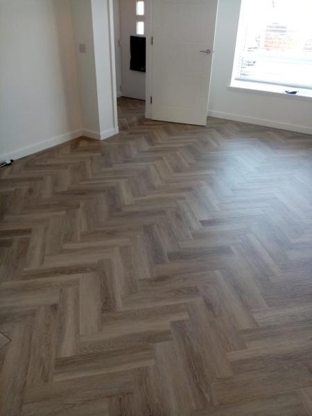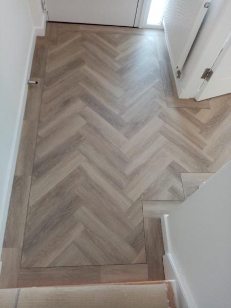 Here we have the first batch of pictures of the year from an installation we supplied and fitted this week. (sorry the pictures aren't so clear - Our fitter needs to upgrade his phone i think lol) Amtico Form colour Foreshore Oak Laid 4.5x18 parquet effect with border feature and 3mm Stria Basalt stripping feature. This was laid to the Kitchen, Lounge, Hall, Back Hall and WC. We prepared the subfloor with 6mm plywood. Beautiful