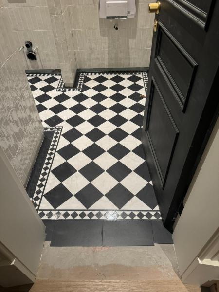 Some pictures of an installation carried out last week. - Amtico Signature Check design in colours Graphite slate and Bianco Classic Marble, with bevelled diamond border and Graphite Slate border. Beautiful!!
